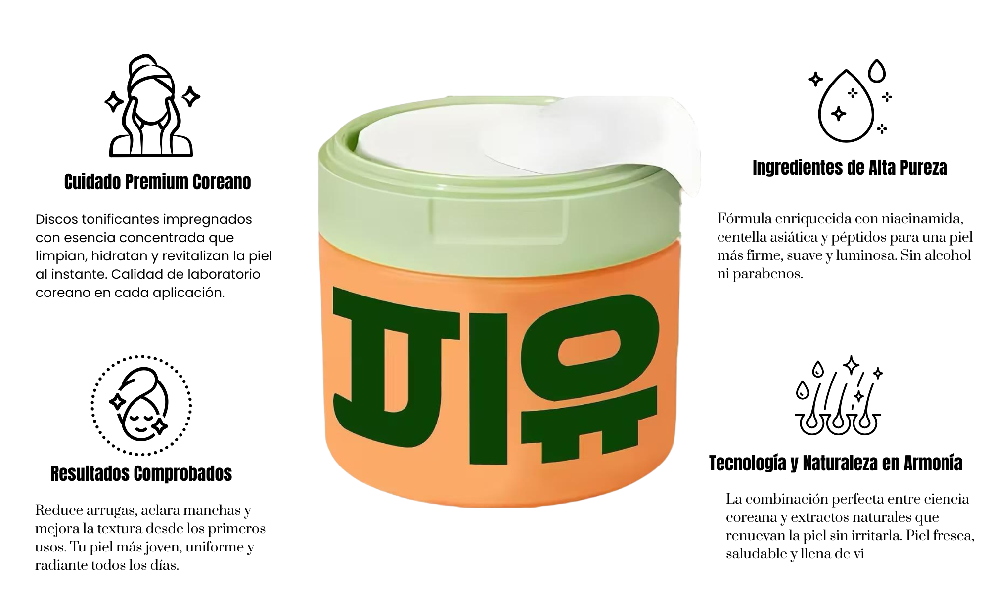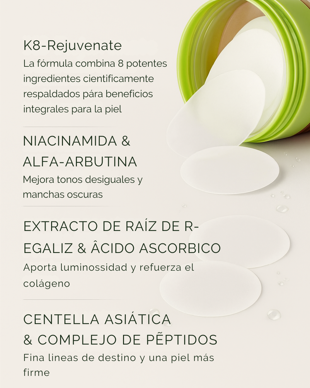 Están formulados con extracto de Centella Asiática, ácido hialurónico y niacinamida — una combinación poderosa que hidrata profundamente, mejora la elasticidad y regenera la piel para un brillo saludable y natural.