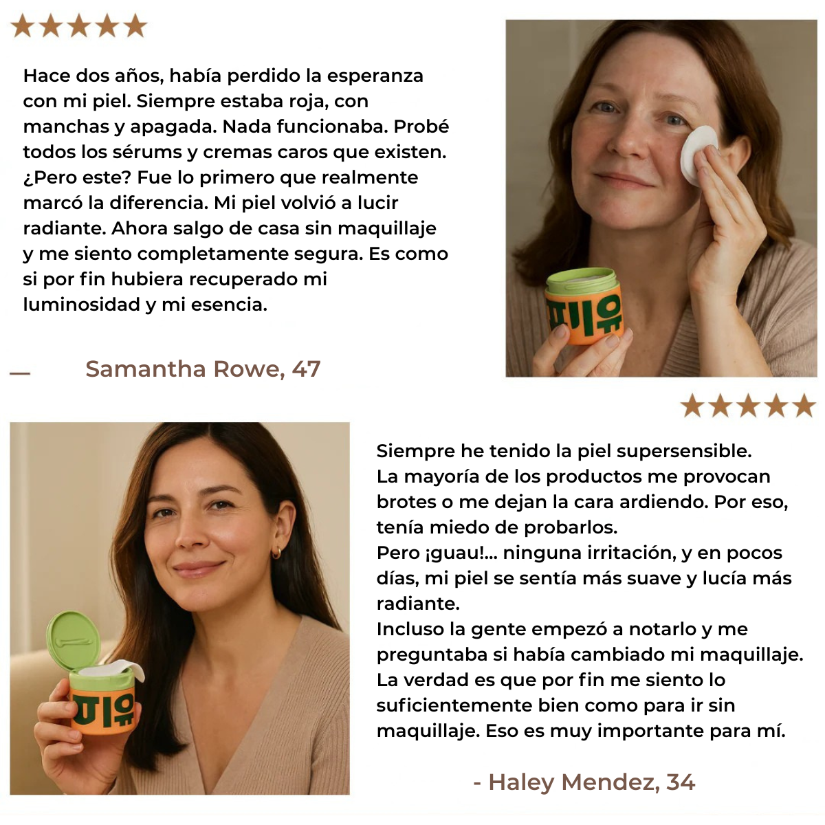 En pocos días, notarás una piel más fresca, luminosa y equilibrada. Con el uso constante, los poros se afinan, las manchas se reducen y la textura se vuelve más suave y uniforme.